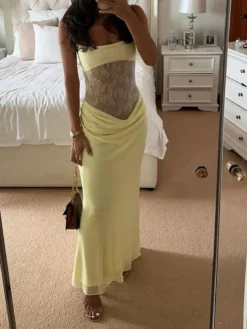Summer Women’s Long Cami Dress for Party Eveing Club Sleeveless Open Back Lace Patchwork Bodycon Dresses