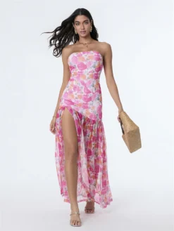Women’s Tube Top Dress Slim Strapless Backless Mesh Patchwork Tropical Leopard Print High Slit Long Dress for Party Club Night