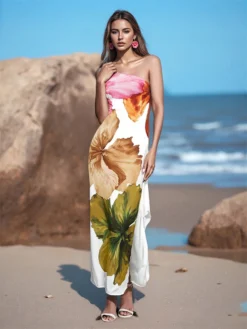 Women’s Summer Long Cami Dress Sleeveless Flower Print One Shoulder Beach Dresses