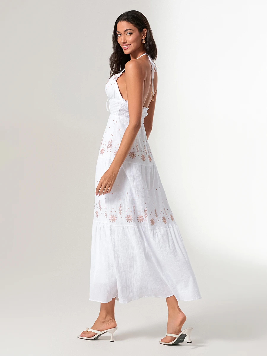 Women Summer Casual Long Dress Flower Embroidery Tie-Up Halter Neck Sleeveless Dress Fashion Backless A-line Dress